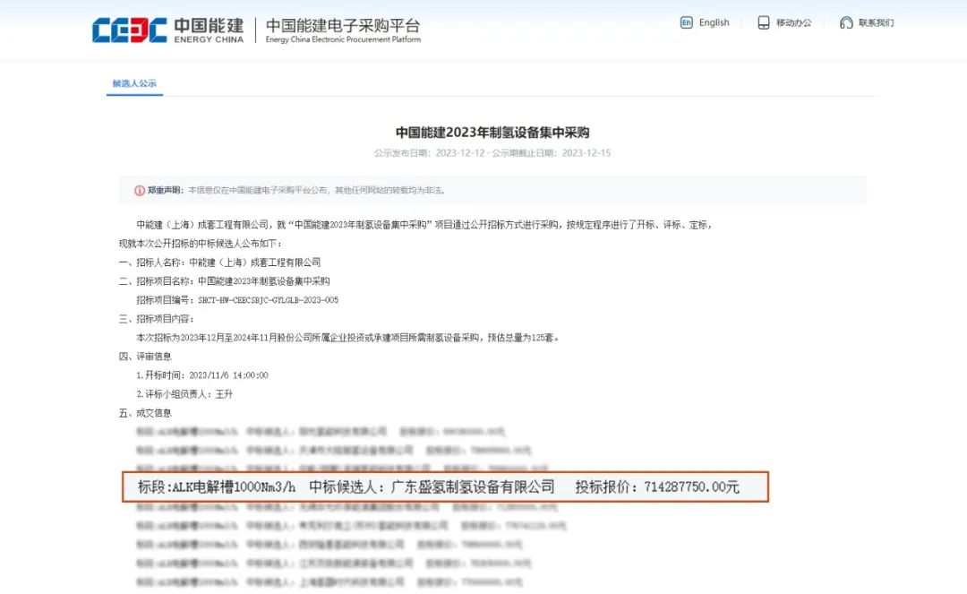 12月12日,中國(guó)能建2023年制氫設(shè)備集中采購(gòu)中標(biāo)候選人公示,昇輝科技(股票代碼:300423)旗下公司廣東盛氫制氫設(shè)備有限公司(下文簡(jiǎn)稱(chēng)“盛氫制氫”)成功入圍,實(shí)現(xiàn)公司大規(guī)模電解水制氫全套裝備領(lǐng)域重點(diǎn)業(yè)務(wù)新突破。